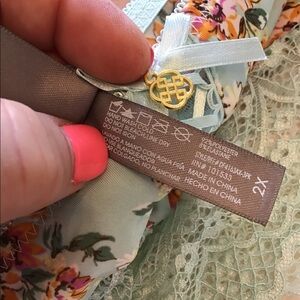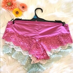 3 pairs: one blue floral with charm detail, one light pink solid pair, one dark pink pair. Floral pair is the only one with the front lace and charm accents. The others have bows.