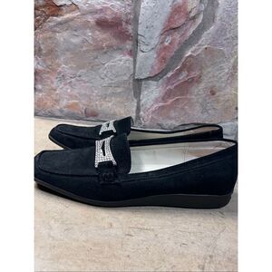 Classic black slip-on flat loafers with a large rhinestone-embellished decorative buckle. Faux suede upper and low heel for comfortable wear. Women’s Size 9.5M.