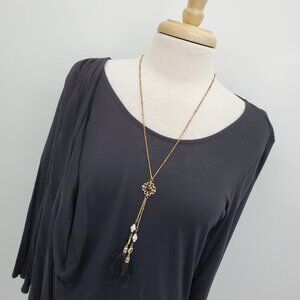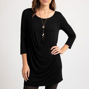 Daisy Fuentes, draped tunic, black onyx top, NWT blouse, 3/4 sleeve tunic, office chic, evening top, minimalist top, bohemian draped blouse, rayon tunic top, chic layering top, trendy womens top, casual chic blouse, modern wardrobe essential, versatile black tunic