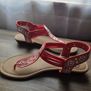 Elegant red sandals with intricate beadwork. Comfortable and stylish for any outing.