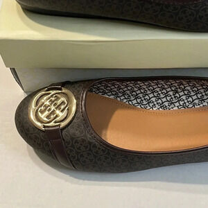 Daisy Fuentes Ruby classic print women’s flats. Stylish flat features slip on and off with logo print lining size 11 color brown, almost new never been worn, cushions comfort insoles for supreme comfort.