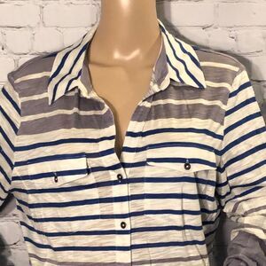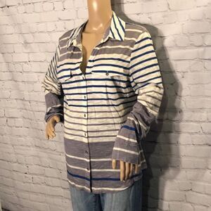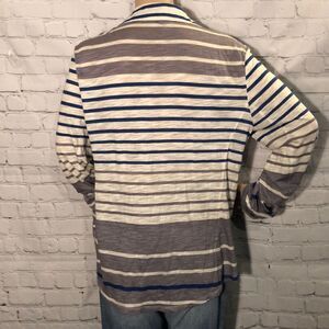 Grey, blue, and white striped long sleeve shirt