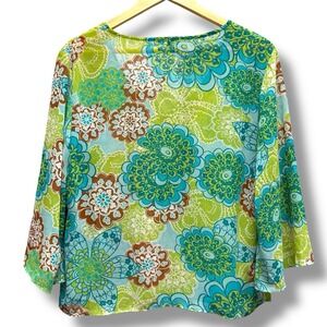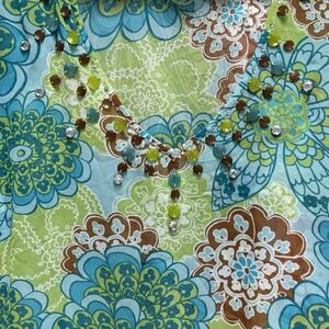 The Daisy Fuentes Sheer Embellished Teal Green Women's Top is a stylish blouse featuring a floral pattern with beaded accents, giving it a bohemian theme. The V-neck and 3/4 bell sleeves add a touch of elegance, while the sheer material adds a lightweight and feminine feel. This top is perfect for women looking for a chic and trendy addition to their wardrobe, in a beautiful teal green color that is sure to stand out.