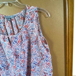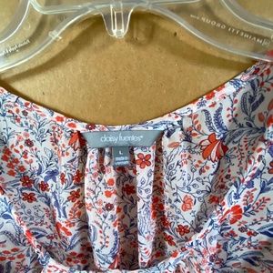 This is a sheer Daisy Fuentes top. It is pink with a blue and orange floral design. The close up photos represent the colors better. The back is long and the front is gathered at the bottom and looks like a wrap around. Very pretty! Didn't wear it very much.