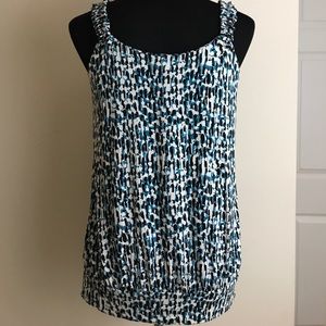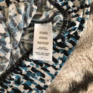 Worn 2-3 times, flattering, super comfy, and soft. Hides a lot of imperfections. In very good condition- fabric pilling but hidden well by pattern and it's just that type of fabric. Could be shaved and cleaned up easily. Ruffled straps and banded bottom.