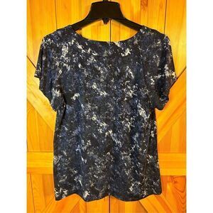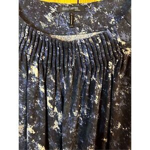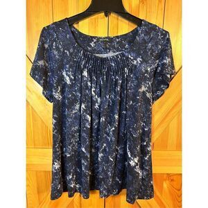 Daisy Fuentes Womens Petite Large blue black, tan, Pleated Neckline Top pit to pit 20” length 25” (3995)