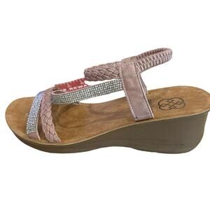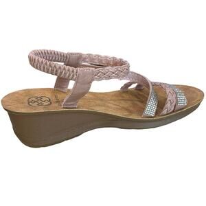 Keywords: Daisy Fuentes, slingback, pink sandals, women's shoes, braided straps, rhinestones, elastic slingback, wedge heel, casual sandals, summer footwear, pre-owned.