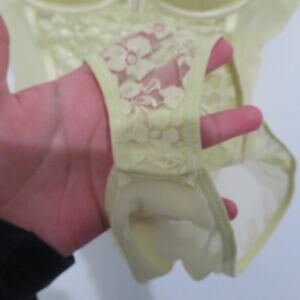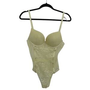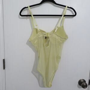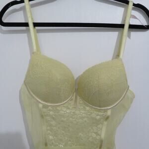 Daisy Fuentes yellow sheer lace bodysuit. Padded cups with underwire. Hook and eye back closure. Floral sheer pattern. Adjustable straps.