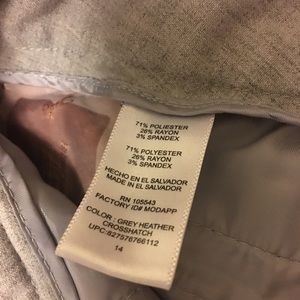 Very comfy, light weight dress pant material. These are capris, not full length pants. Light feather grey color. Amazing condition. Only worn a few times before they were too big for me. Fit true to size at size 14 regular. Make me an offer using the offer button! Thanks :)