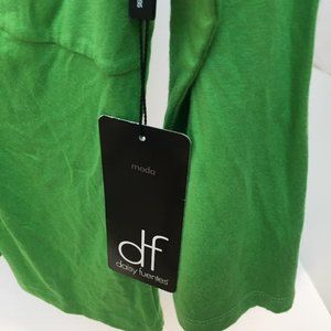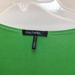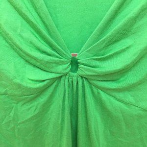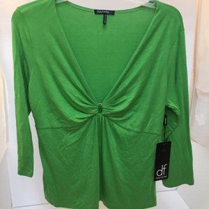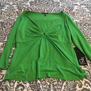 Top has 3/4 sleeves and a deep V neck. There is a silver metal ring at the base of the v-neck. It’s gathered at the bust and is looser at the bottom half of the top. This is 95% rayon, 5% spandex and has great stretch. Top is size medium and measures 20” from armpit to armpit and is 24” in length.