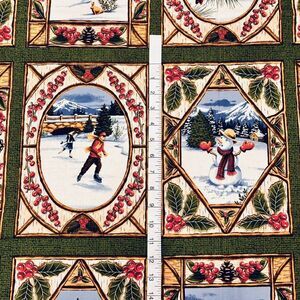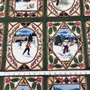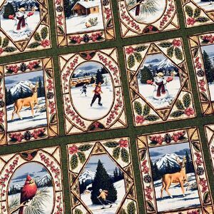 Fabric Panel with skier, cabin, skaters, red cardinals, snowmen, deer