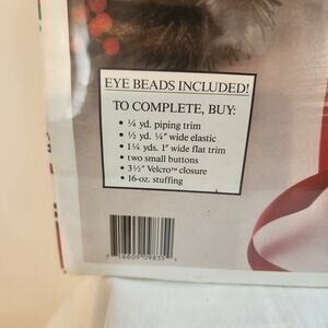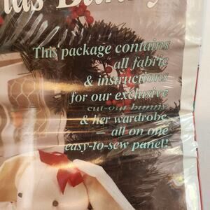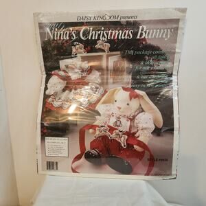 Vintage Daisy Kingdom sewing panel kit, Nina’s Christmas Bunny (Style #9835), copyrighted 1991. This cut-and-sew kit includes all fabric panels and instructions to make a Christmas bunny doll with apron and wardrobe. Eye beads are included; additional supplies (trim, elastic, buttons, stuffing, Velcro) required as listed on the back.
