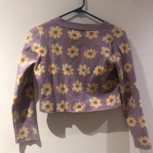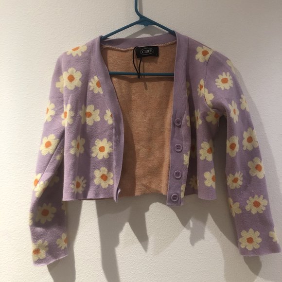Pale yellow and orange daisies on lavender background. Soft and stretchy, button up, size large, by Cider. Sleeve length 19".
