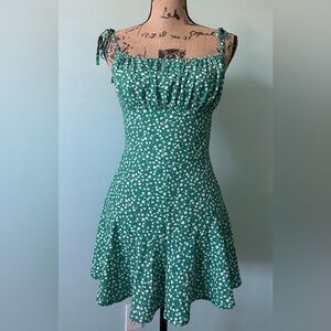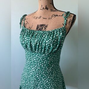 Green daisy romper with flared legs, looks like a dress. Adjustable straps, zipper at back. Perfect condition