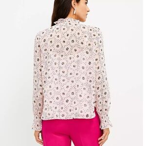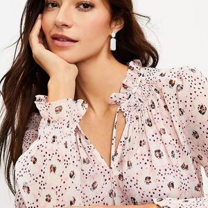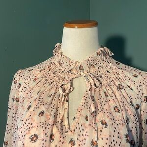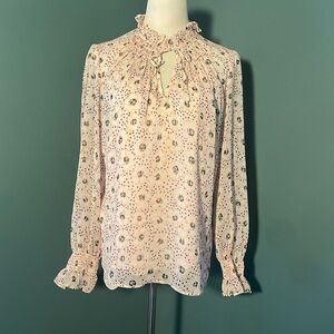 Chic floral print blouse with elegant ruffle details. Features a keyhole neckline and long sleeves. Light airy material with built in slip