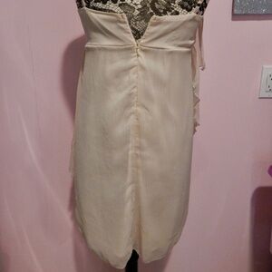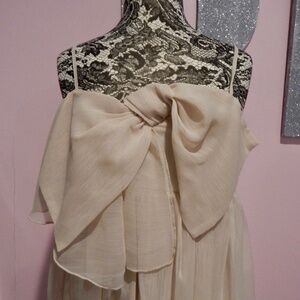 This cute cream colored gossamer dress is fully lined and zips in the back. The straps are adjustable and made of the same gossamer fabric as the dress. And lets not forget the darling bow on the front that makes this dress so unique. The dress does zip up all the way, but my mannequin is a little busty so I couldn't zip it up all the way.