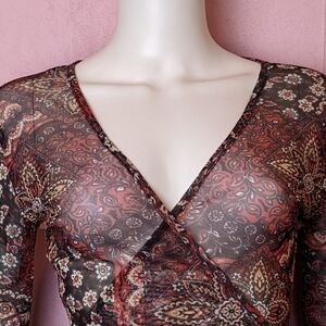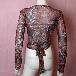 Daisy Street Dolls Kill Sheer Mesh Mixed Print Long Sleeve Wrap Top