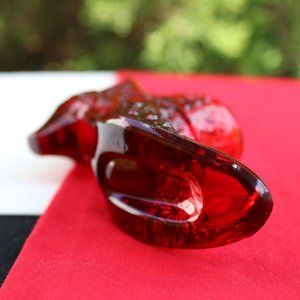 This little slipper was made by "Smith Glass" in amberina red glass. Made in the "Daisy and Button" pattern through the 1970s. In like new condition with no chips, cracks, scratches or flea bites. Glows yellow quite nicely under a black light. Measuring 2 3/8in. tall and 5 7/8in. in length.