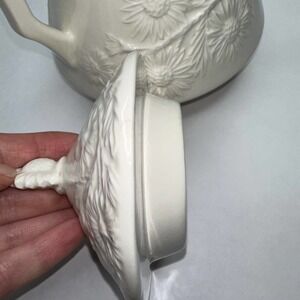 Cottage-style, cottagecore mini sunflower or daisy teapot or coffee pot. Made in 70's this drink serve ware can be used for anything. The lid had a flower handle that looks like a daisy or mini sunflower. No chips or cracks. There was a mark on lid but it seems to be a normal mark, it is not a crack or chip. Please view all my photos, and measurements in photos. In wonderful preowned condition. Please view (zoom in) photos for a visual description. Ships fast, completely smoke-free environment. Ivory or cream color.