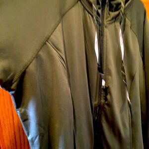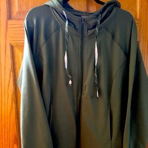 Daisy Fuentes olive fit jacket. Very sporty with hoodie & thumb slit.