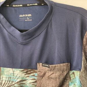 Navy tee with grey accents. Features a tropical print stripe and pocket. 3/4 length sleeves.
