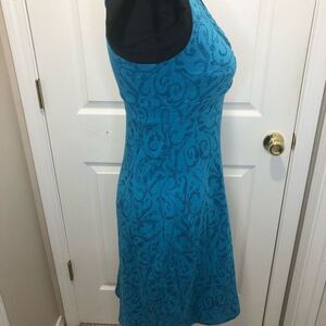 Dakini blue active/athletic and casual dress. Midi length, scroll design throughout, cross cross straps in back, removable bra pads. Form fitting and lightweight. Length 37in, pit to pit 24in., x small. ❤️