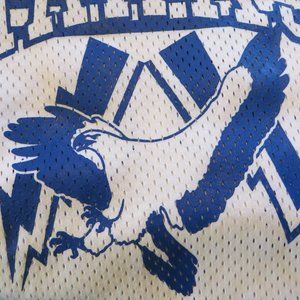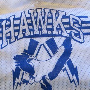 Two team shirts by Dakka. I believe these to be hockey jerseys. I have searched for this logo, many teams use hawks as name, could not find this exact one. The blue one is size XL. Is 34 inches long in back, 31 inches long in front. 17 inch sleeve. 22 inches arm pit to arm pit. Has a white spot on back as pictured. White one is size 2XL. 30 inches long in front, 35 inches long in back. 19 inch sleeve. 25 inches arm pit to arm pit. This one has several black marks and stains. Could have been game or practice worn. From a smoke free home.