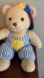 This charming stuffed animal features a soft, plush texture and a classic teddy bear face with a small brown nose and round dark eyes. Dressed in blue and white striped overalls with a yellow bib and a jaunty blue cap, this teddy bear is perfect for cuddling and imaginative play. Pre owned in great condition