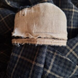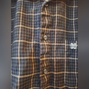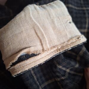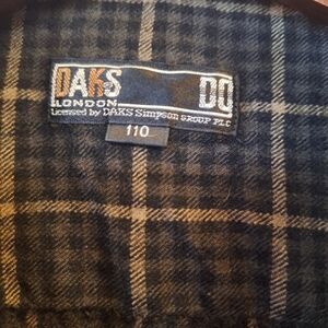 Daks London mens flannel. Wool Blend. Medium weight. Button down front. Collared. Black, tan and gray plaid. Fabric tag missing. Right interior fabric is torn around the cuff, pic in last 2 photos of the cuff turned inside out(can't see damage unless it's turned inside out) Mens size 110 M/L Pit to pit flat lay 23" length from collar to hem 30" measurements are approximate
