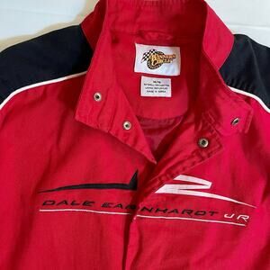 This Winners Circle Red Dale Earnhardt Jr #8 size 14/16 jacket is in excellent used condition and ready for the next young racing enthusiast. The outer-shell is 100% cotton and the lining is 100% Nylon. It is thick and very well constructed with lots of room for patches to be added on if desired. Measurements are included in the photos.