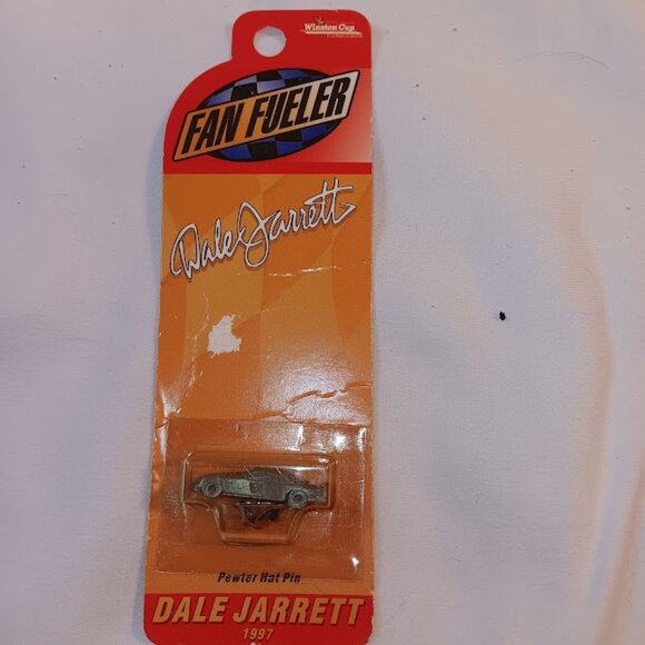 The product is a pewter hat pin/tie tack featuring NASCAR driver Dale Jarrett's car. It is branded by Fan Fueler, a NASCAR league fan apparel and souvenir company. This one-size product is a perfect accessory for fans of auto racing and Dale Jarrett, making it a unique and collectible item for supporters of the sport.