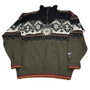 The Dale Of Norway 2003 St Moritz Pure Wool Sweater in Green Fair Isle is a classic and colorful piece of men's clothing, perfect for casual occasions. This tight-knit sweater features a mock neck and long sleeves, with a 1/4 zip pullover style for easy wear. Made of high-quality wool and hand washable, this sweater has a vintage look with accents like a zipper and logo detailing. Designed in Norway, this sweater brings a touch of ski and cabincore themes to your wardrobe, making it a stylish choice for those who appreciate retro fashion from the 90s and Y2K era.