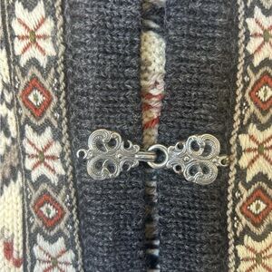 Authentic Dale of Norway 100% wool cardigan sweater with traditional Norwegian pattern and pewter hook clasps. Main color is a dark grey.