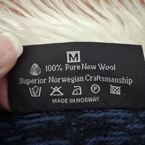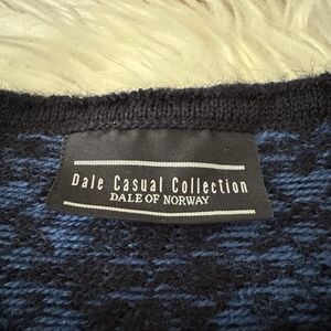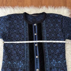 Dale Of Norway Wool Sweater Womens Medium Black Blue Fair Isle Button Cardigan. See pics for measurements (in my opinion runs a bit small). A Norwegian medium fits closer to a US womens small. Black velour detailing with button closure. Logo embroidered on sleeve as shown. From a smoke free/pet free home