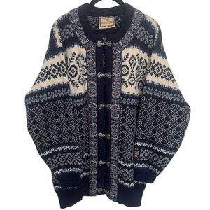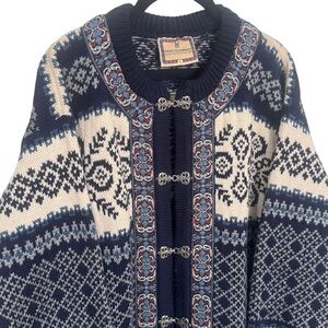 Dale of Norway Blue and White Fair Aisle Winter Print Merino Wool Sweater Size L