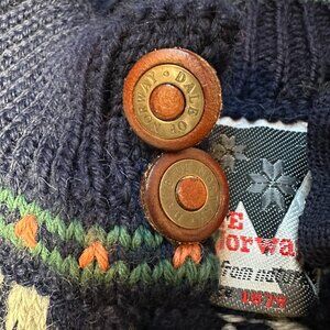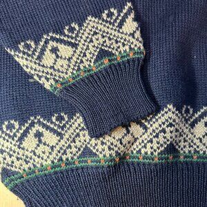 Classic Nordic ski pattern sweater of 100% wool. Very heavy weight- this will keep you warm!! Quarter zip closure and 2 buttons at top. Also has the Dale patch on it circa 1995