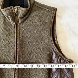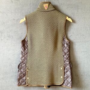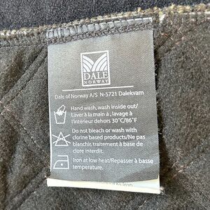 Vintage Dale of Norway women's size S vest. Olive green wool knit with brown quilted fabric with stand up collar and full zip. Flap pockets with snap closure. Weatherproof. Water repellent. Hand wash.