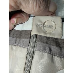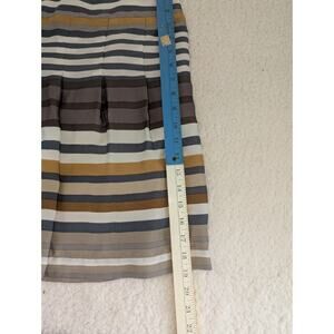 The Dalia Collection pleaded striped skirt in multi-color, size 4, is a stylish and versatile piece perfect for casual occasions. Made of lightweight polyester fabric with a mid-rise, this mini skirt features horizontal stripes in shades of tan, beige, dark blue, medium blue, light gray, and taupe. The skirt is designed with a zipper closure and is recommended for dry clean only. Its unique design and colorful pattern make it a standout addition to any woman's wardrobe, suitable for wearing in the summer, fall, and spring seasons.