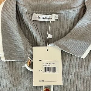 Elegant gray ribbed shirt with wide legs. Features a collared top for a chic look. Perfect for versatile styling. New with tags. See closet for tons of great items. Offers welcome, send one over. Next day shipping, 5 ⭐️ seller! Cheers! ❤️