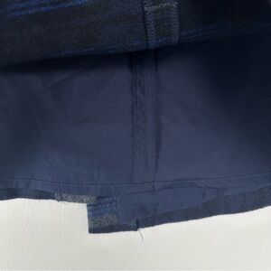 This is a Dalia Collection skirt in size 12, made of blue wool blend tweed with an asymmetrical design. The skirt features an Aztec Western Rodeo theme, a geometric pattern, a zip closure, and zipper accents. It is suitable for party, casual, summer, fall, and spring occasions, and is lined with a short mini length perfect for a cowgirl or southwestern look.