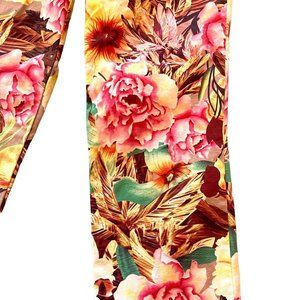 Dalia Collection Ladies Capris Pants Floral Size 2 Stretch 97% Cotton 3% Spandex. Bright Tropical Floral Print in Shades of Burgundy, Pink and Yellow.