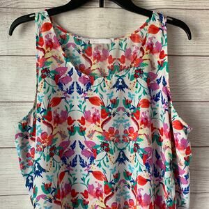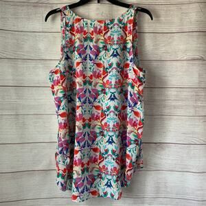 Multi-colored floral sleeveless blouse or tank top by Dalia. This blouse has red, turquoise, light blue, pale yellow, dark blue, and light purple-ish pink flowers and leaves in the pattern. It has a rounded slightly scooped neckline in the front and back. The bottom sides have rounded, petal-like, overlapping slits. It is pre-owned and in great condition.