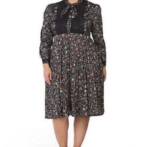 Dalia MacPhee dress floral long sleeve size 1X lace details, partial button front, neck tie, side zipper closure, pleated