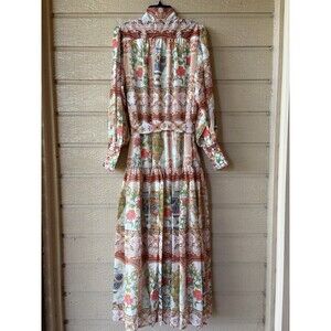 New with Tag, Dalia MacPhee women's White with Brown Multicolor Floral Grecian Urn Print Long Maxi Dress, size Medium (4-6 per size chart), stand-up Nehru collar with 17 decorative pearl button front closure, gathered torso with full loose ruffle hem skirt, non-attached tie belt (dress can be easily worn with a belt or without a belt), long puff sleeve with 2 decorative pearl button cuff closure, relaxed fit.