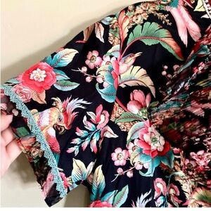 Dalia MacPhee Short Sleeve Tie Neck Tropical Floral and Bird Mini Dress with Lace Trim