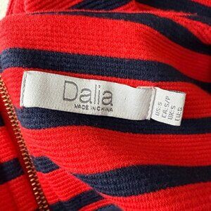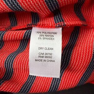 The Dalia Orange & Navy Striped Dress is a stylish and versatile option for professional settings, cocktail parties, or any special occasion. With its flattering sheath style, knee-length (depending on height) design, and 3/4 sleeves, it offers a sophisticated and polished look. The bold combination of orange and navy stripes adds a pop of color to your wardrobe, making it a standout piece for any office or party ensemble. Size small. Rear zip closure.