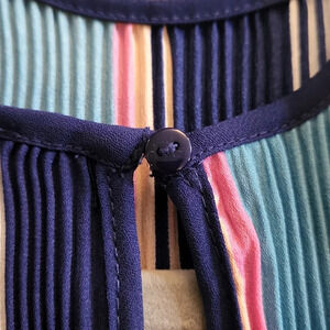 Keywords: Dalia blouse, multicolor striped top, pleated sleeveless blouse, flowy top, keyhole back, size large blouse, summer blouse, dressy casual top, women's polyester top, vibrant sleeveless blouse, chic work blouse, layered look top, lightweight top for women.