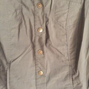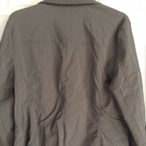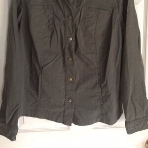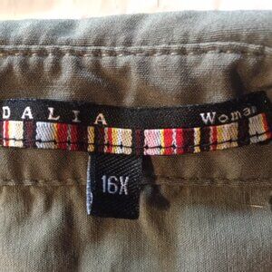 In like new condition is a very nice shirt/jacket, could be worn as either, by Dalia. This shirt is very weighty, stretches, heavy duty snap buttons, two top pockets and two side pockets, very nicely constructed, a dark army green, women's sixe XL/16