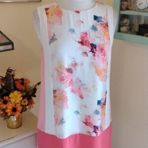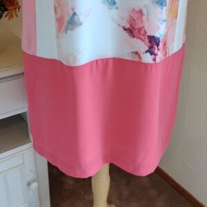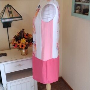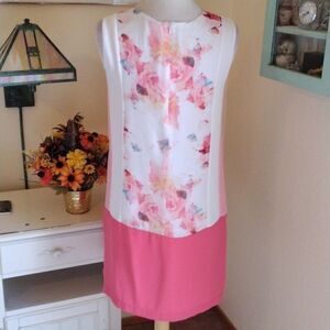 Beautiful shift dress in layers of sheer floral fabric. Fully lined, back zip. Vertical panels. Wide 11 inch panel at bottom. Size 8 measures 38 at chest and waist, 40 at hips, 35 long from shoulder to hem. This dress will float so prettily over your curves.