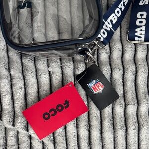 Transparent bag featuring Cowboys logo. Navy strap with team name.